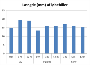 Billernes størrelse (længde) blev også opgjort og her er billedet omvendt. I CA-systemet var billerne gennemsnitligt større, end de var i de to jordbehandlede systemer. Også med hensyn til antallet af edderkopper var billedet omvendt. Der er markant flere edderkopper i markerne uden jordbehandling (CA) sammenlignet med både reduceret jordbehandling (Pløjefri) og konventionel jordbehandling (Konv). Dette kan også være en af grundene til, at der er flere løbebiller i marker med øget jordbehandling, da konkurrencen mellem de forskellige grupper reduceres og der derved er mere tilgængeligt føde til løbebillerne.