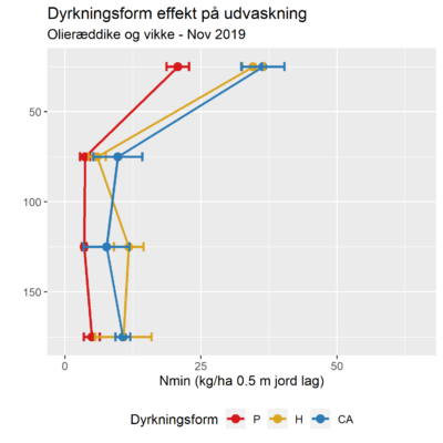 Vi kan se, at der i parceller med olieræddike er et reduceret Nmin-indhold i de dybere jordlag, og den tendens ser vi i alle tre dyrkningsformer. Effekten er dog højst i marken med dyrkningsform H (pløjefri jordbearbejdning, harvning i 10 cm). Dette kunne skyldes en forskel i den pågældende jords tekstur, sammenlignet med de to andre marker.