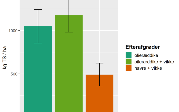Resultaterne har ikke vist signifikante forskelle mellem efterafgrødeudbytterne i de tre forskellige dyrkningsformer. Dog lidt højre olieræddikeudbytte ved den reducerede jordbearbejdning – indikator for at der er mere N tilbage i det øverste jordlag.