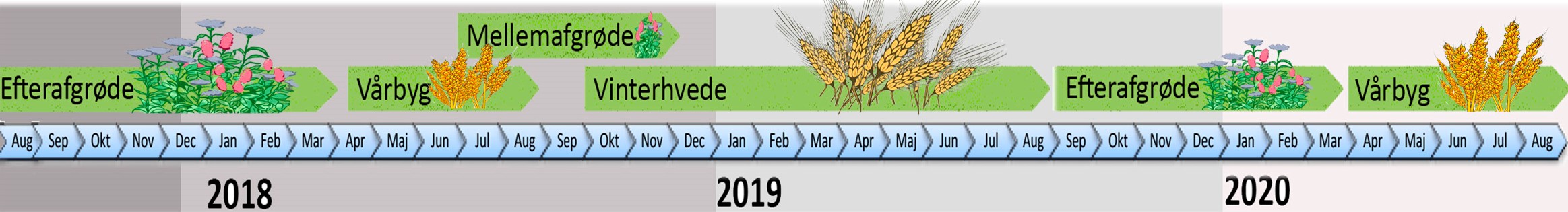 Illustrationen ovenfor viser dyrkningsplanen for de tre forsøgsmarker. Udviklingen følges løbende, så de tre dyrkningsmetoder kan sammenlignes.